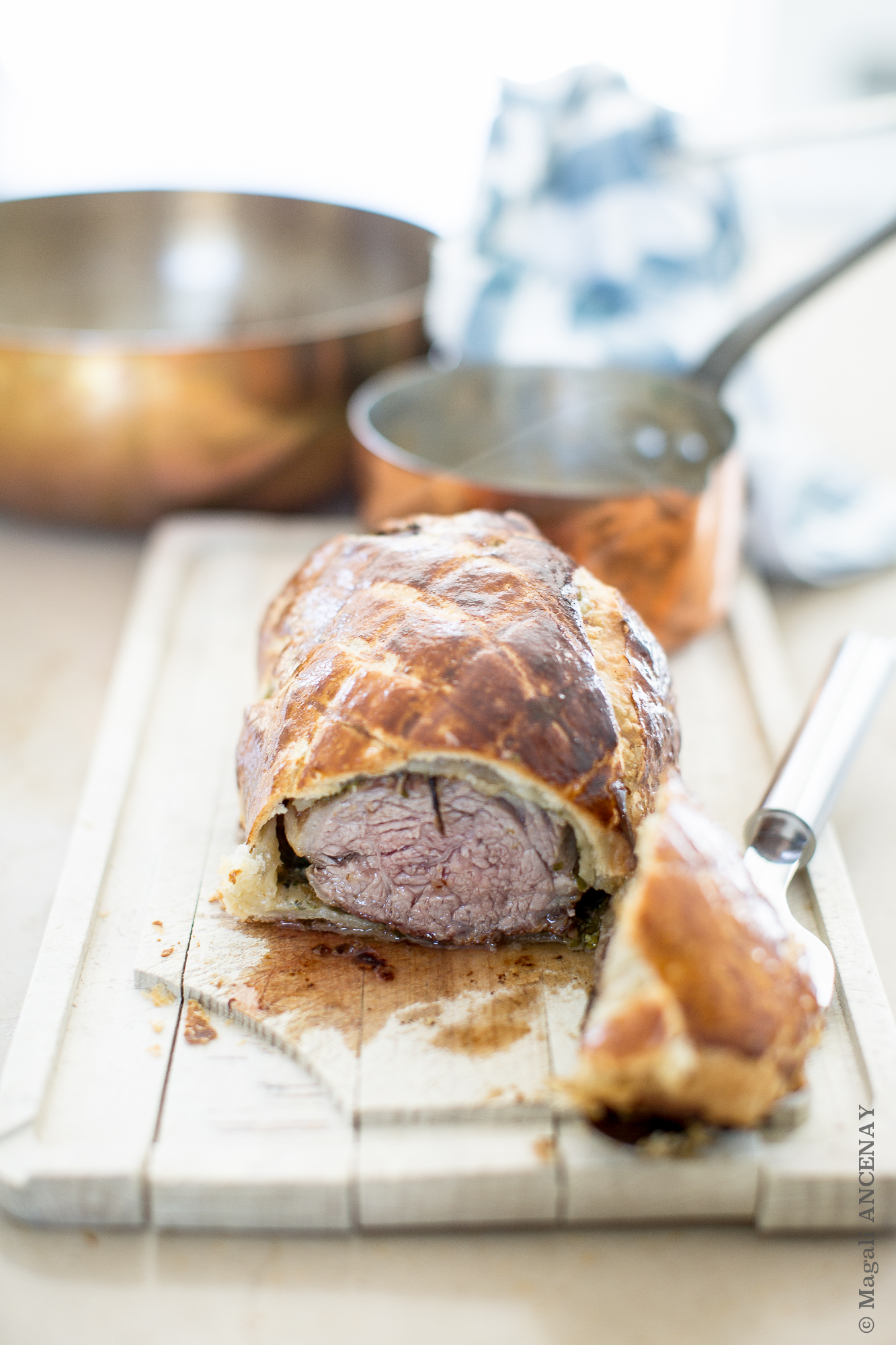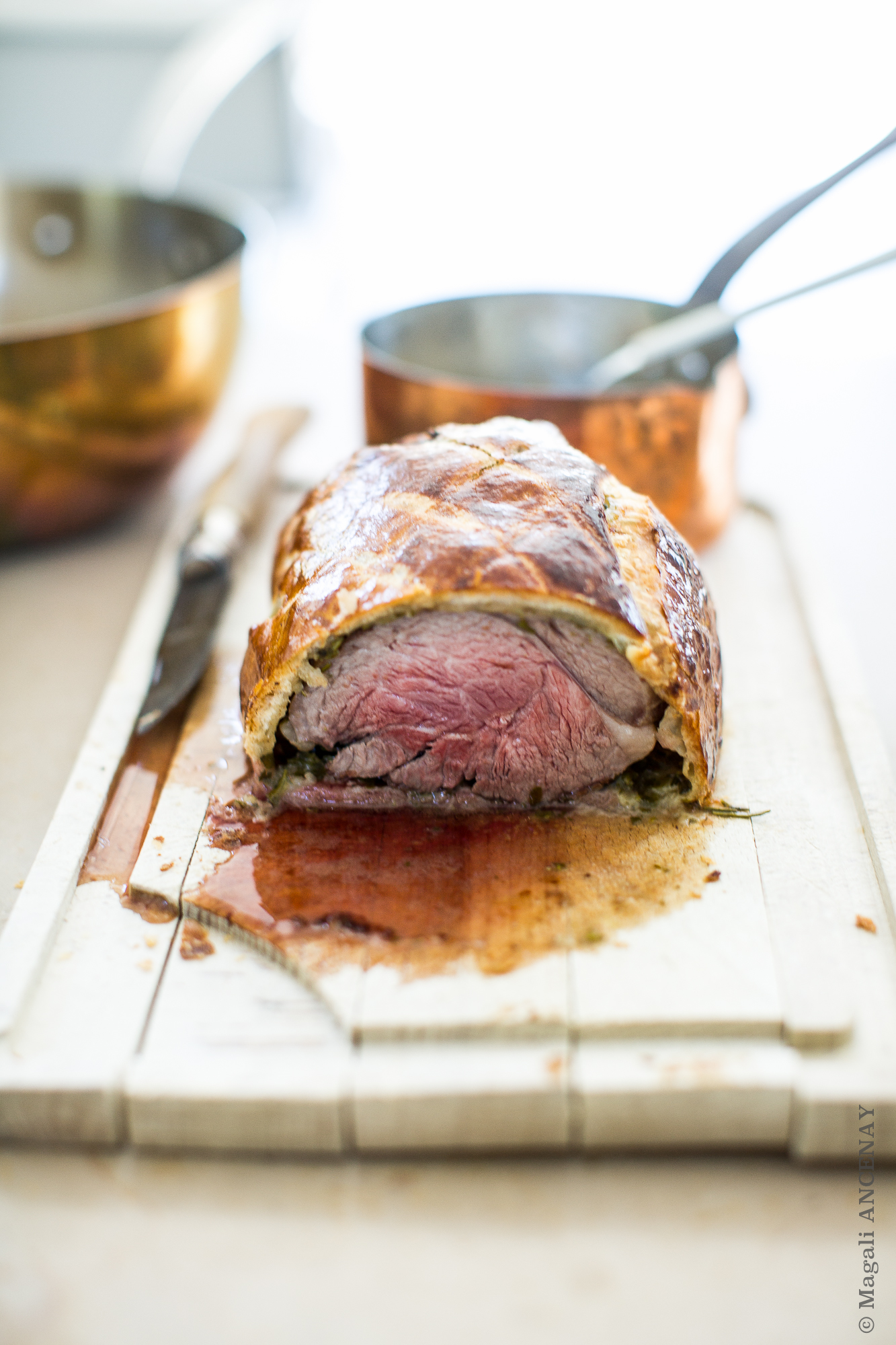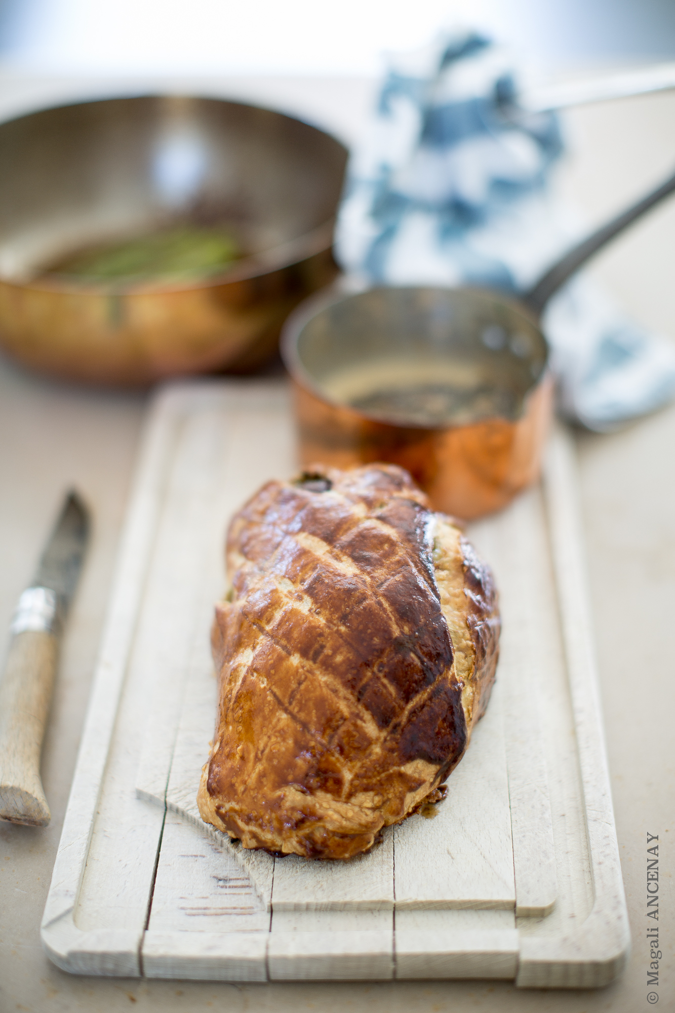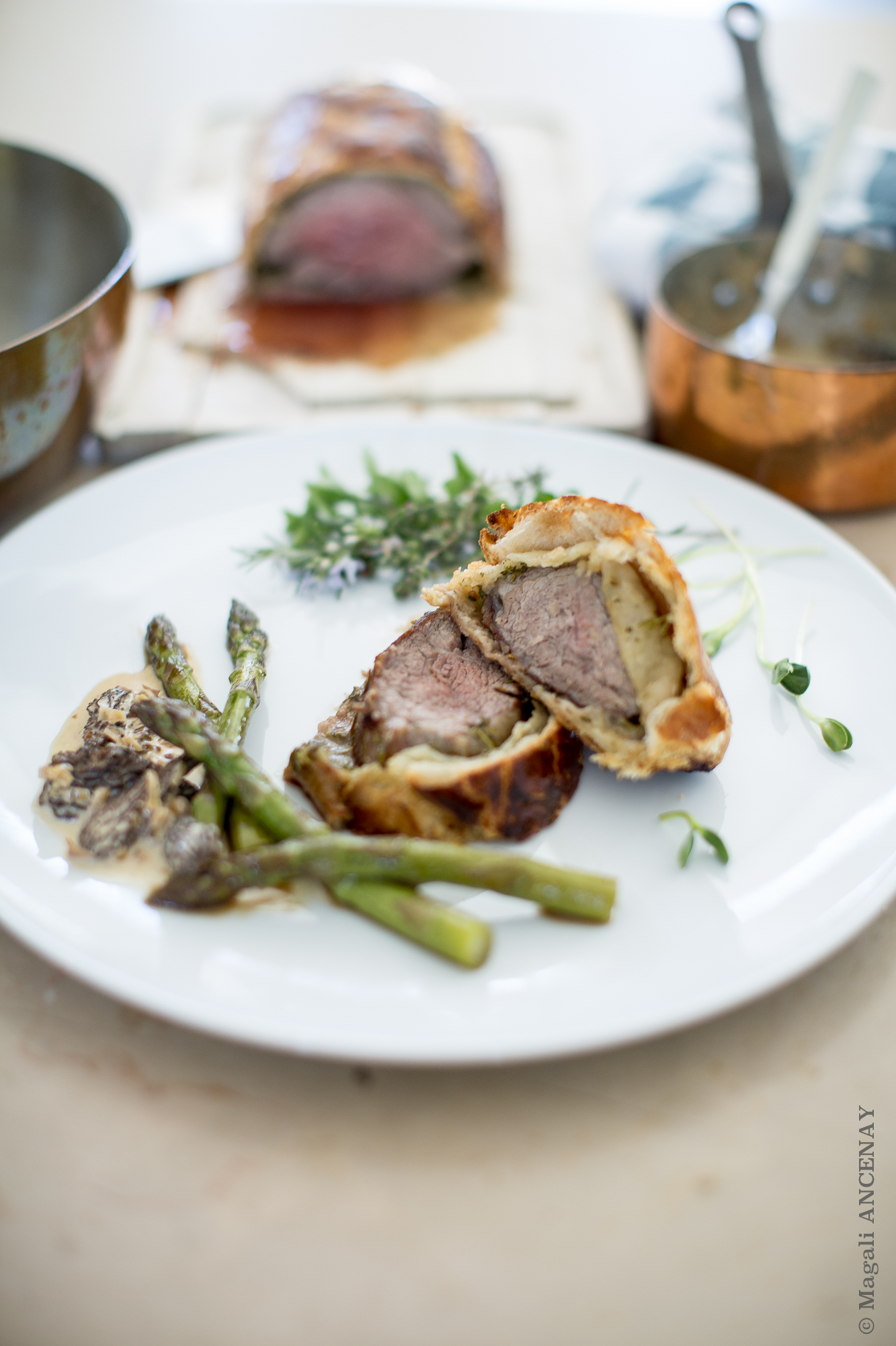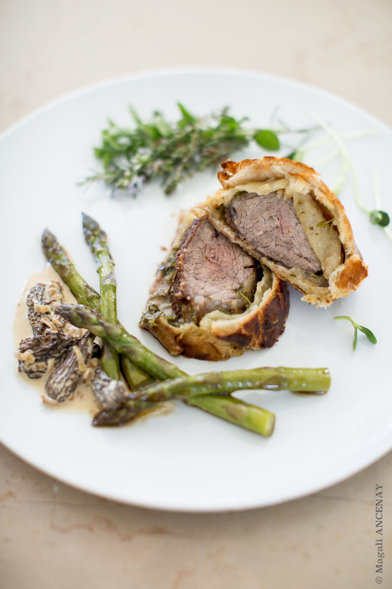 Faire cuire dans le four TH 200° pendant 27 minutes. Personnellement j’aime la viande assez cuite, mais le coeur était bien rosée, une cuisson idéale. Pour les personnes qui la préfèrent encore plus rosée réduire le temps de cuisson de 2 voire 3 minutes en moins. J’ai servi ces tranches de selle en croûte feuilletée, avec quelques asperges de saison et une crème de Morilles qu’il me restait du repas de la veille (Feuilleté d’asperges aux morilles fraîches, une recette de Marc Haerbelin), que je posterais prochainement.