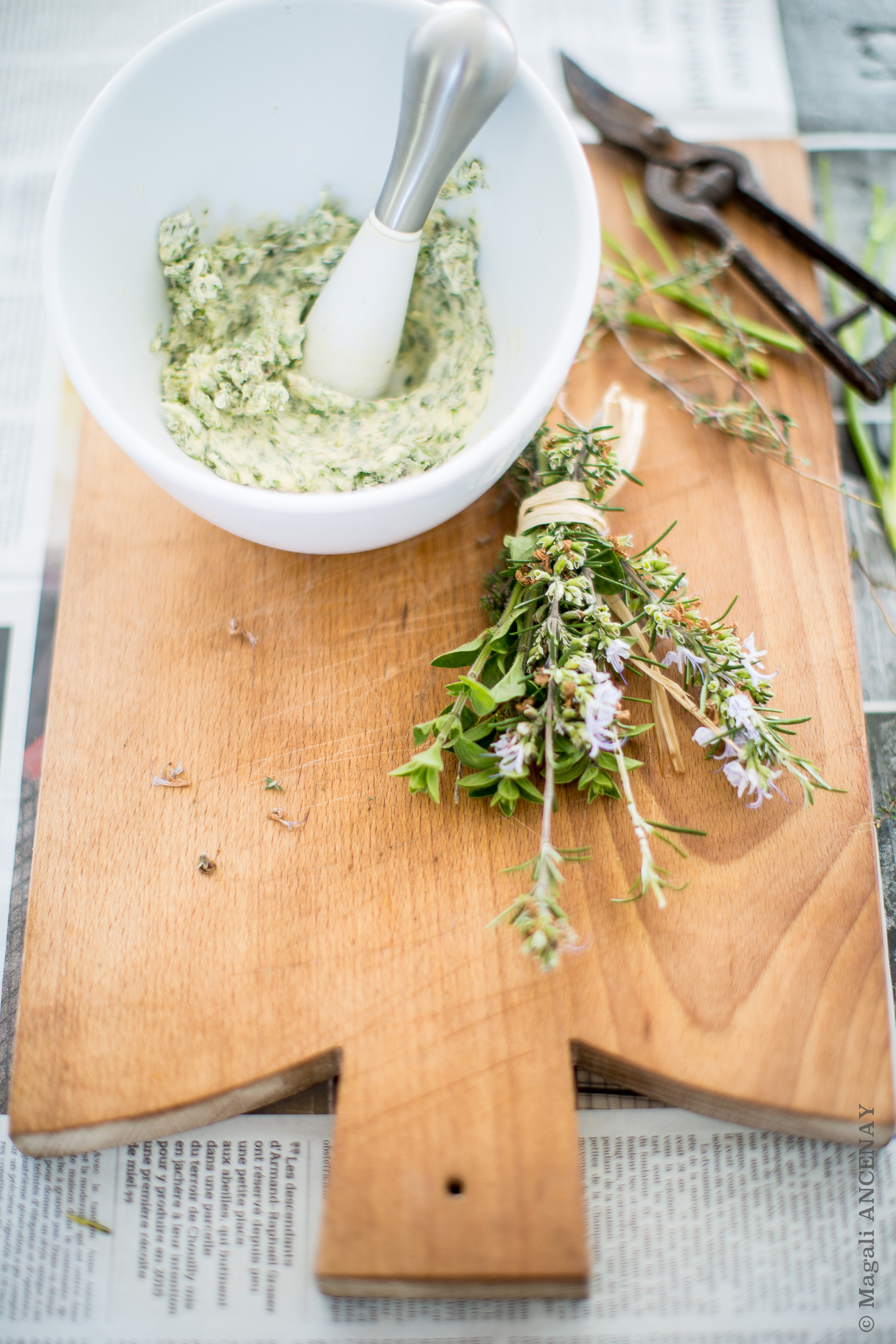 Sortir la viande une heure avant et la mettre en température, tout comme le beurre. Dans un pilon ou un mini robot, hacher grossièrement les herbes et l’ail, mélanger au beurre pommade, assaisonner de sel et de poivre du moulin. Mettre au frais.