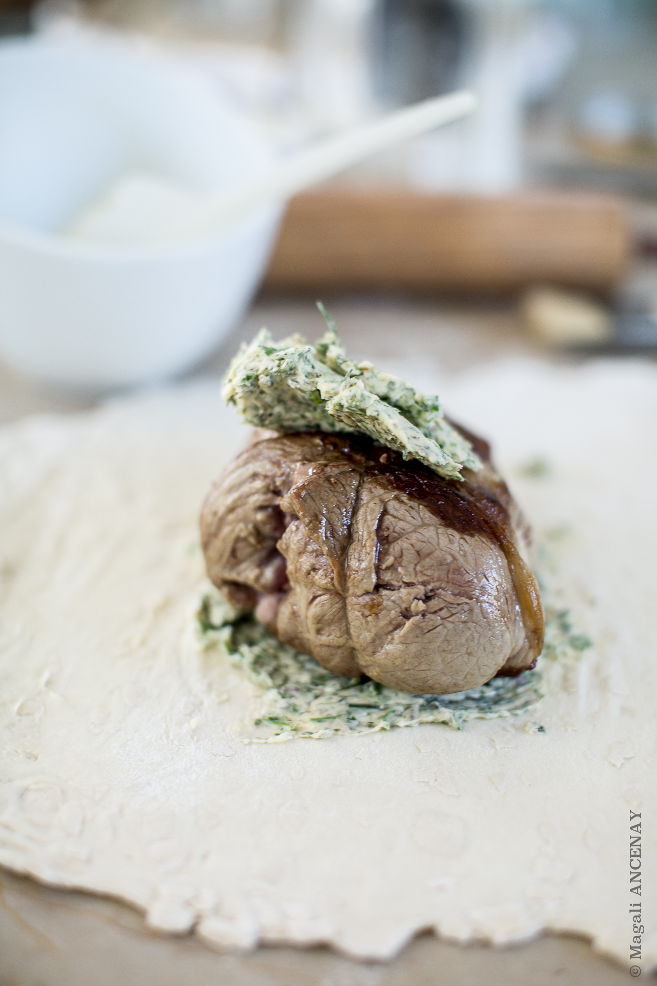 Allumer le four Th 200°. Dans un poêlon, verser un filet d’huile d’olive et faire dorer sur toutes les faces l’agneau, sur un feu assez vif. Retirer et laisser reposer. Sortir le beurre d’herbes du réfrigérateur et enduire généreusement sur toutes les faces . Etaler la pâte feuilletée, faire un rectangle de la taille de votre pièce de viande. Envelopper cette dernière de pâte feuilletée en prenant soins de bien souder les extrémités. Dans un bol, mélanger le jaune d’oeuf avec un peu de crème liquide et badigeonner le dessus, à l’aide d’un pinceau. Dessiner des croisillons avec la pointe d’un couteau, sans percer la pâte.