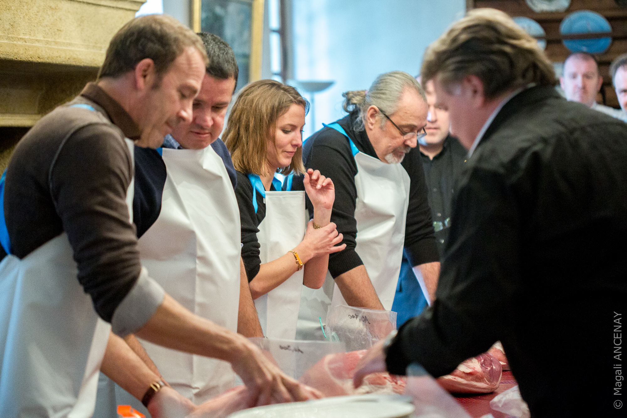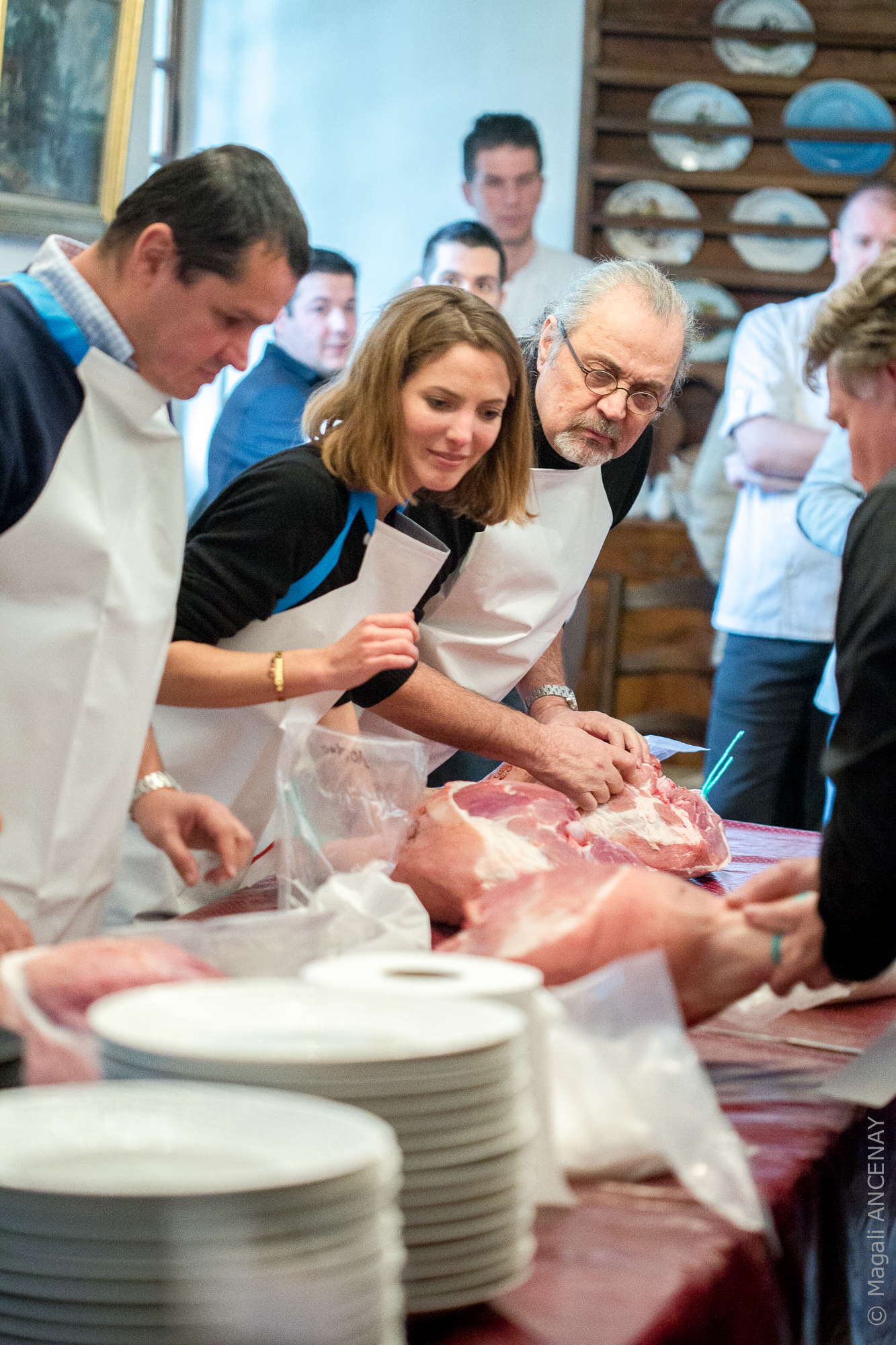 C’est le plat réalisé par le chef Jérôme Nolin du restaurant Avenio à Avignon qui l’a emporté, avec ces filets de caille rôtis et cuisses confites, salsifis et noix, en accord avec un AOC Châteauneuf du Pape, Château de Vaudieu rouge 2006. Nous retrouverons donc Jérôme Nolin pour la finale qui s’annonce haute en saveurs, créativité et symbiose avec le vin imposé. Au terme de ce repas, les invités d’honneur sont passés en cuisine pour effectuer le salage d’un beau jambon des Etablissements Guèze , sous les yeux de Christophe Guèze Maître Charcutier. Ils récupéreront le fruit de leur travail dans un an, temps de salaison minimum pour réaliser un bon jambon cru.