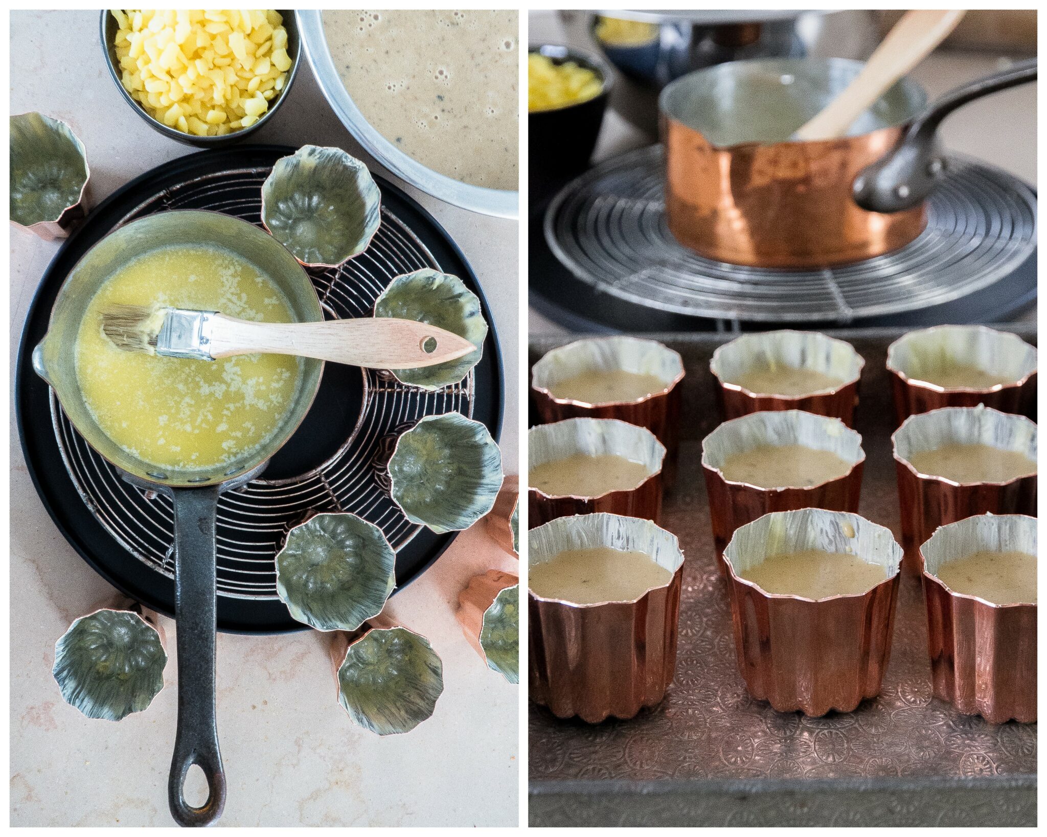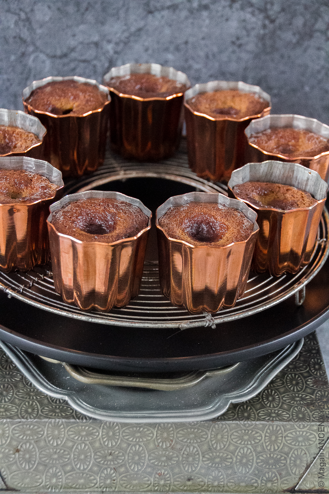 Quant aux recettes que vous trouverez sur le net ou dans les ouvrages sur le sujet, elles se ressemblent toutes, à quelques grammes prêt. Le temps de cuisson aussi diffère d’un pâtissier à l’autre, et surtout en fonction de la taille et de la matière des moules que vous aurez à utiliser. Ici, j’ai pris des moules en cuivre, intérieur rétamé, de 5,5 cm de diamètre et je ne les ai rempli qu’au 3/4.
