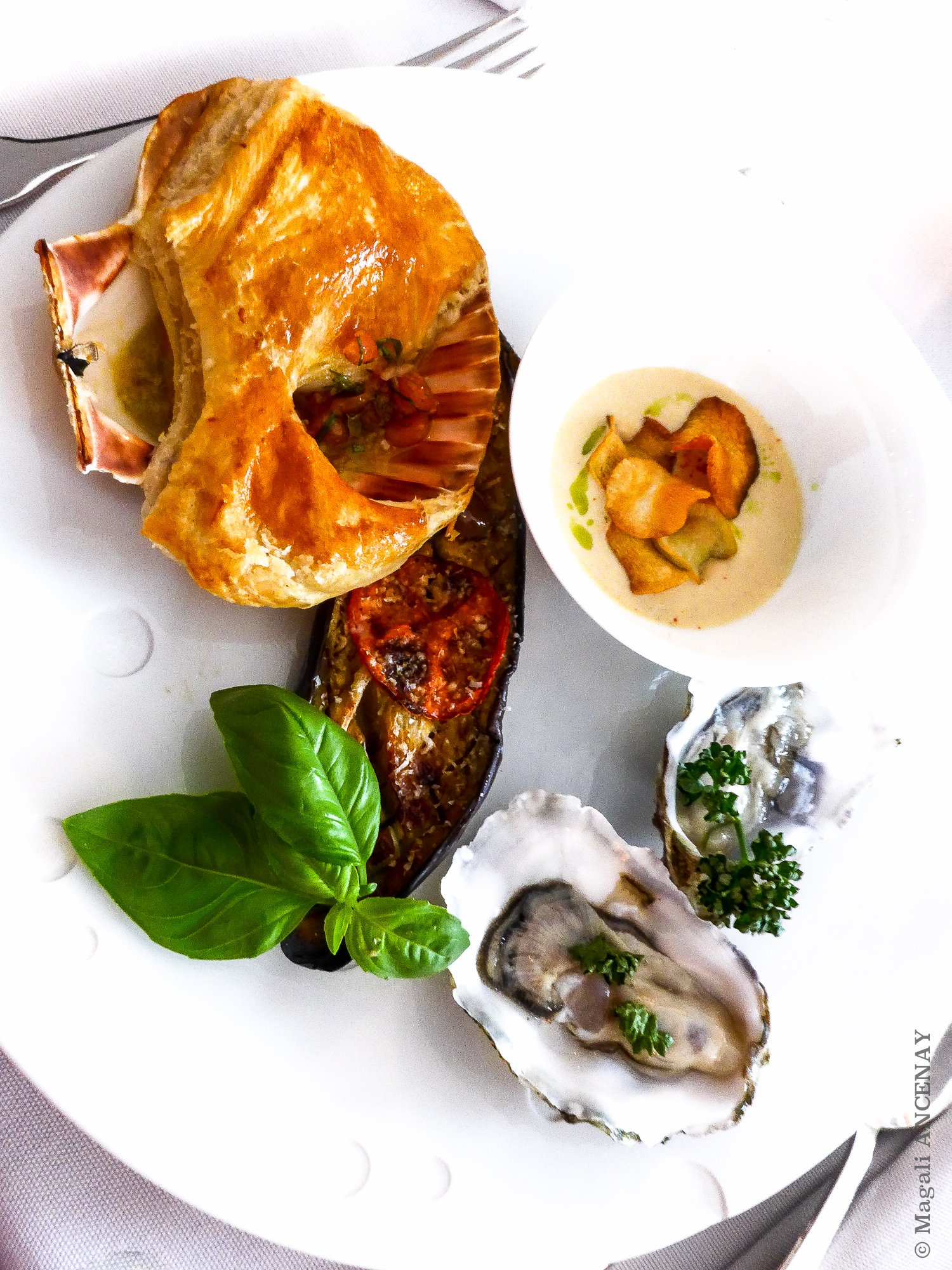 L’apéritif nous ai servi dans la salle à manger….olives vertes, mousses de courgettes et focaccia, le tout accompagné d’un très bon champagne, sous l’oeil averti du personnel.Un superbe buffet d’entrées nous ai proposé, salades composées, aubergines confites, pâté en croûte, huîtres, jambon cuit, Pata Négra, Sain-Jacques en croûte, soupe au pistou et soupe de potiron. Le choix fût difficile….Comment résister à de telles victuailles !