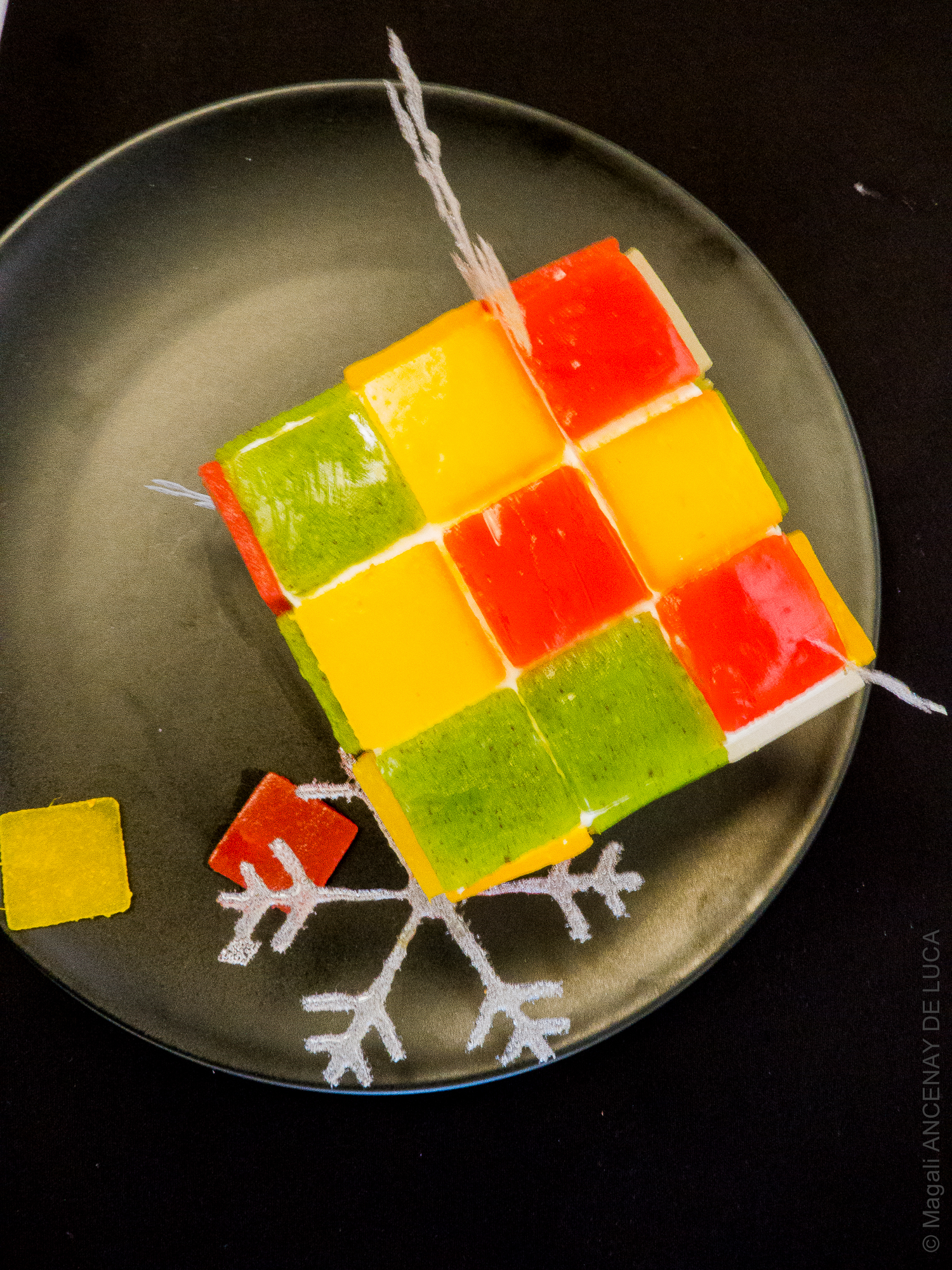 UNE TABLE AU SUD – Fanny APPROCHER – « La Rubik’s Bûche » Kunquat praliné, une bûche pour terminer sur une note de couleurs.inédite et non commercialisée. Plus d’infos sur les Menus de Fêtes de fin d’année => http://bit.ly/1Tk8RGD