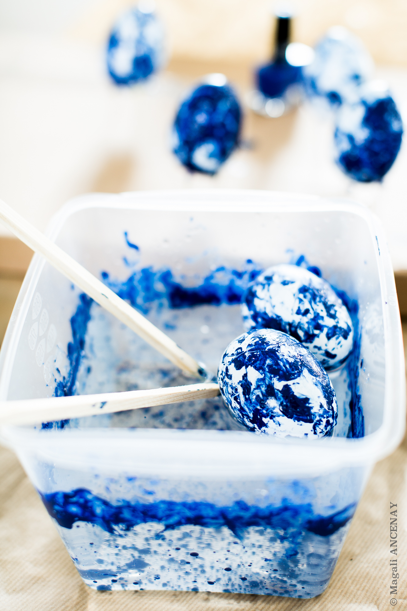 6 oeufs en plastique à décorer 1 vernis à ongle couleur Bleu Indigo 1 contenant en plastique 1 paire de gants latex 1 jeux de baguettes chinoises en bois de l’eau à température ambiante (surtout pas froide) Quelques épingles à tête 1 morceau de polystyrène ou à défaut comme moi, un carton assez dur.