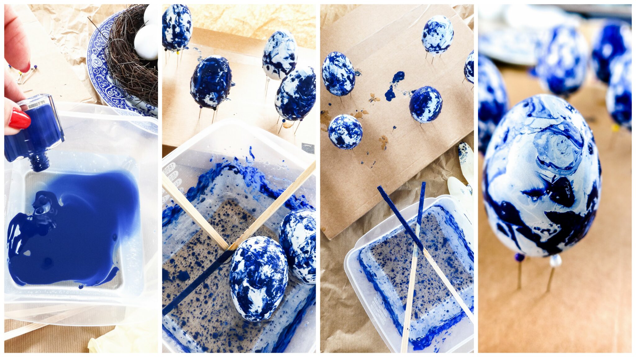 Pâques c’est le retour du printemps, c’est le traditionnel repas de famille, c’est aussi la re naissance que ce soit de la végétation, ou des êtres vivants. Il est pour habitude et comme le veut la tradition, que nous ayons un attrait particulier pour les oeufs et ce, dans le monde entier. Symbole chrétien pas excellence, il représente avant tout la vie et le re nouveau. Afin de parfaire ma décoration de table en accord avec ma vaisselle chinée, dans les teintes de Bleu indigo, j’ai vu passer sur Pinterest une idée lumineuse sur le blog d’Alice et Lois, où deux soeurs Sarah et Mélissa, nous expliquaient le technique pour la réalisation de ces oeufs effet marbré, qui apporteront une note festive à notre table de Pâques.