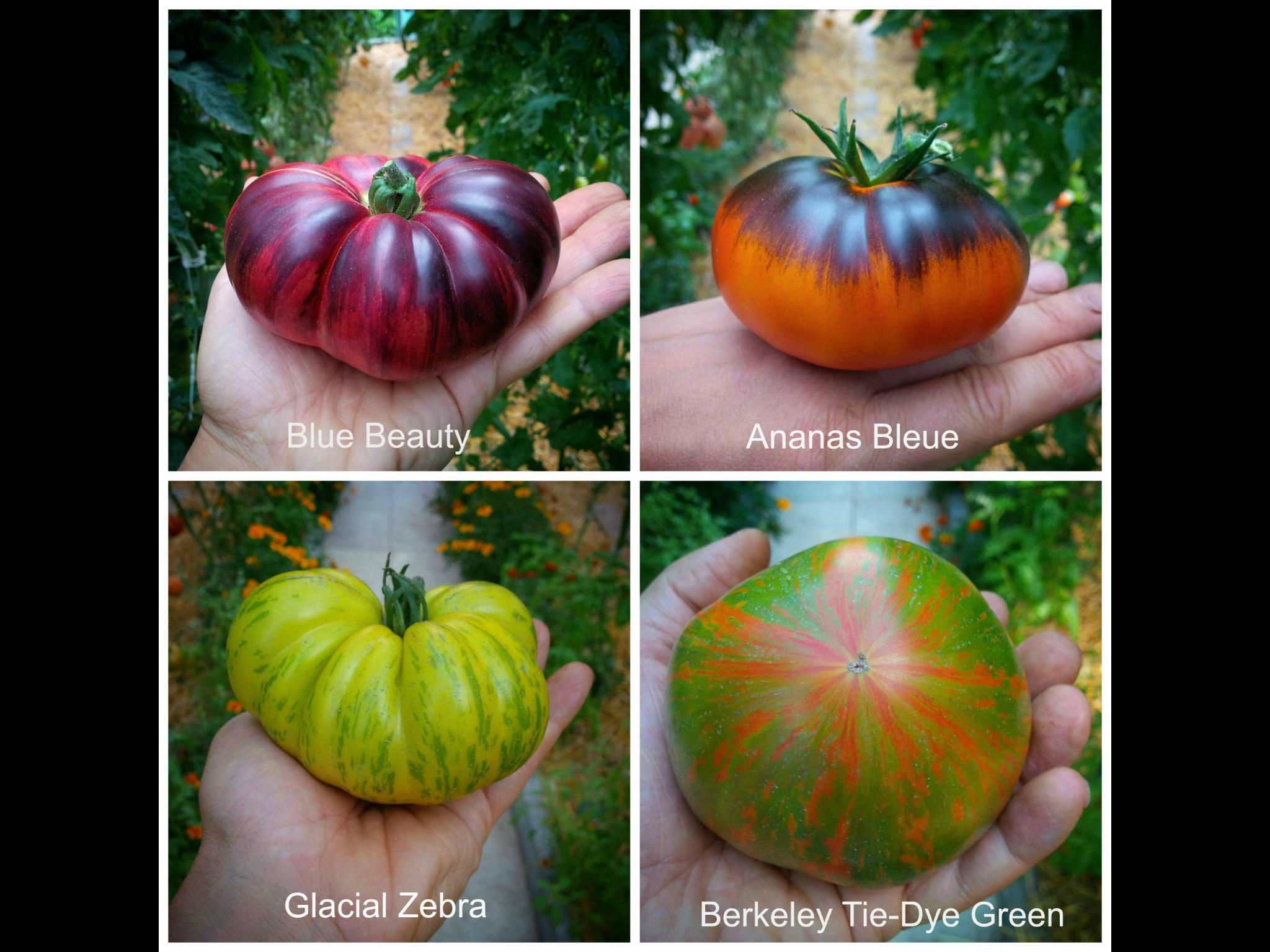 “Berkeley Tie-Dye Green“, Variété fixée originaire de Californie. Elle est issue d’un croisement de “Cherokee Purple” et de “Green Zebra” (deux variétés déjà expérimentées chez moi, mais remplacées dans ces catégories de pourpre et de verte). Le fruit rose rougeâtre sombre avec des stries vertes aplati de 6 à 10 cm de diamètre, pouvant dépasser le kilo. Ombilic en trait liégeux. Maturité : 85 à 90 jours. Chair juteuse, esthétiquement sans égal, et au goût subtil, sucrée et absolument fabuleux. Croissance indéterminée.